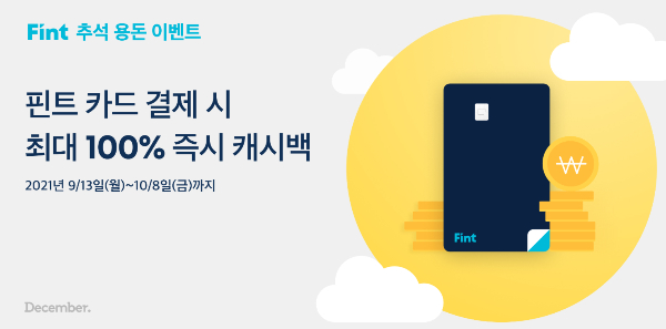 인공지능(AI) 간편투자 금융 플랫폼 '핀트(Fint)'를 운영하는 디셈버앤컴퍼니자산운용(디셈버)은 핀트카드 이용 시 결제 금액의 최대 100%를 핀트머니로 돌려주는 '핀트 추석 용돈 이벤트'를 진행한다고 13일 밝혔다.