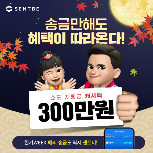 외화전문 네오뱅크 센트비는 추석 연휴 마지막 날인 오는 22일까지 송금 수수료 전액 무료와 300만원 상당의 효도지원금을 주는 '한가WEEK 프로모션'을 진행한다.