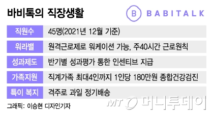 "연장근로? 그런거 없어도 1인당 매출 4.4억 낸다"주당 40시간의 업무시간을 맞춰 워라밸(일과 삶의 균형)을 보장하는 것도 같은 맥락이다. 바비톡에 따르면 직원들의 업무시간은 대부분 일 8시간, 주40시간을 넘기지 않는다. 인원이 적은 스타트업 업계 특성상 야근 등 초과근무로 주 60시간 근무가 일상적인 것과는 대조적이다.