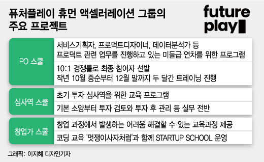 ▶석: 스타트업도 시장 상황의 변화에 따라 사업의 본질적인 가치를 훼손하지 않는 범위에서 피보팅(pivoting·다른 비즈니스 모델로 전환) 한다. 사람도 피보팅이 가능하다. 강점을 유지하되 필요로 하는 직무에 맞는 기술·지식을 배워야 한다. 30~40년 전 기업과 지금 스타트업의 조직 문화는 굉장히 달라졌다. 하지만 달라진 것을 알아도 그에 필요한 역량이 무엇인지를 배우고 경험할 기회가 없다. 그렇기 때문에 좋은 교육 프로그램을 거쳐 커리어 피보팅을 할 수 있어야 한다. 퓨처플레이의 휴먼 액셀러레이션 사업은 투자 기업들은 물론 스타트업 생태계에서 실무 경험을 쌓을 수 있도록 도울 수 있어 기존과는 다른 유형의 프로그램이 될 것이다.