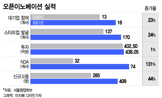 16일 서울시와 SBA에 따르면 지난해 서울창업허브의 '대기업 오픈이노베이션 프로그램'에 참여한 대기업은 16개사, 스타트업은 170개사다. 이는 프로그램을 시작한 2020년에 비해 대기업은 23%, 스타트업은 24% 증가한 것이다. NDA(비밀유지계약)를 체결하며 협업한 사례는 2020년 32건에서 2021년 74건으로 두배 이상 늘었다. 이로 인한 신규고용도 2020년 285명에서 지난해 409명으로 44% 증가했다.
