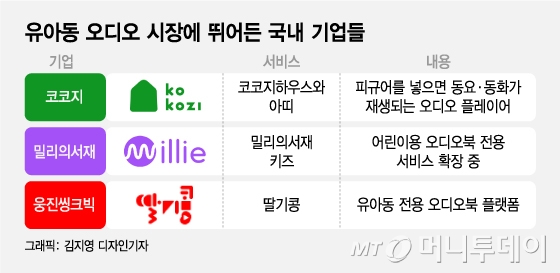 그밖에 교육·출판기업 웅진씽크빅도 지난해 유·아동을 위한 월정액 오디오 플랫폼 '딸기콩'을 출시해 관련 콘텐츠를 서비스하고 있다. 웅진씽크빙 측은 딸기콩이 지난해 5월 출시 이후 연말까지 7개월여만에 회원 16만명을 확보하는 등 성과를 내고있다고 밝혔다. 네이버의 음원 스트리밍 플랫폼 바이브도 지난해 말 어린이 사용자를 위한 키즈 카테고리를 추가했다.