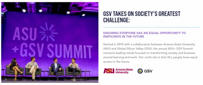 GSV홀딩스는 2010년부터 매년 미국 샌디에이고에서 ASU+GSV 서밋을 개최해왔다. IT 기술로 교육 현장의 혁신을 주도해온 전세계 교육 전문가들이 한자리에 모이는 세계 최대 규모의 에듀테크 콘퍼런스다.