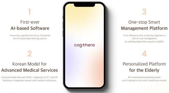 경도인지장애 디지털치료제(DTx) 중 확증임상시험을 승인받은 제품은 코그테라가 최초다. 코그테라는 치매 발병 전 단계인 인지기능 저하 상태의 경도인지장애 환자를 대상으로 인지기능을 개선한다.