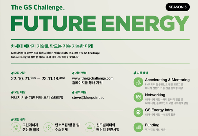 스타트업 액셀러레이터(AC) 블루포인트파트너스가 GS에너지와 함께 차세대 에너지 스타트업을 육성하는 오픈이노베이션 프로그램 '더 지에스 챌린지 퓨처에너지(The GS Challenge. Future Energy)' 3기를 모집한다고 24일 밝혔다.