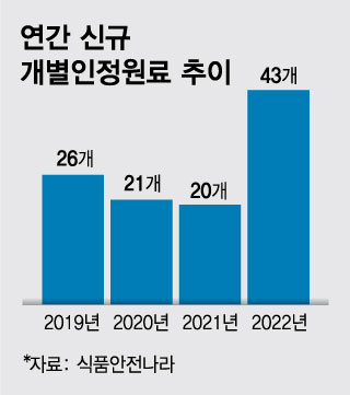 3일 식품의약품안전처(식약처)가 운영하는 식품안전나라에 따르면 지난해 개별인정형 원료로 신규 인정, 등록된 품목은 43개다. 2021년 20개에 거의 두배 수준이다. 올해도 벌써 8건이 추가 등록됐다. 개별인정형 원료는 고시되지 않은 기능성원료를 건강기능식품 기업들이 기능성 및 안전성에 대한 자료를 식약처에 제출해 인정받는 것이다. 개별인정형 원료 개발에 성공한 업체는 6년간 독점 제조, 판매 권리를 가진다. 독점 기관이 경과하면 고시형 원료로 전환 가능한데, 시장을 선점하기엔 충분한 시간이라는 게 업계의 설명이다.