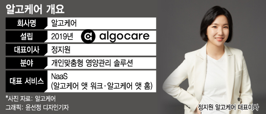 알고케어가 올해 출시를 목표로 개발 중인 개인맞춤형 영양관리 솔루션 'Naas'에 대한 설명이다. 알고케어는 김앤장 변호사로 일하던 정지원 대표가 2019년 설립한 회사다. "사회에 더 많은 영향을 미치는 일을 하고 싶다는 생각을 하던 중 헬스케어 분야 창업에 관심이 생겼어요. 그때 '앞으로 인간 사회의 모든 한계가 없어지고 시간과 에너지만 남을 것이다. 시간과 에너지를 아껴주는 건 AI(인공지능)이고, 늘려주는 건 헬스케어다' 생각했죠. 헬스케어 하면 운동과 영양제를 흔히 떠올리잖아요? 그 동안 홈피티 등 운동 기술은 발전했지만 영양제는 수십년 전 인기 제품이 지금도 가장 잘 팔려요. 시장을 혁신하면 임팩트가 크겠다고 생각했죠. 그러던 중 주말에 TV를 봤는데, 노부부가 영양제 수십종을 그날그날 잘라서 드시더라고요. '나도 저렇게 누가 해주면 좋겠다' 생각하다 보니까 비슷하게 하는데가 없더라고요. 알고케어를 시작하게 된 배경이에요."