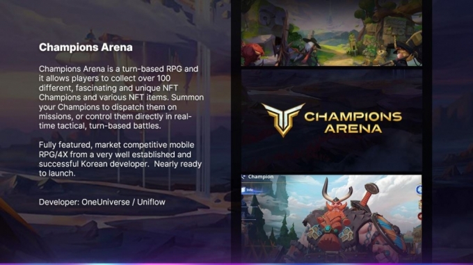 챔피언스 아레나는 NFT(대체불가능토큰) 기반의 게임으로 글로벌향의 그래픽과 뻬어난 디자인의 캐릭터, 탄탄한 콘텐츠가 강점이다. 또한 턴베이스 RPG(역할수행게임)로 100명이 넘는 매력적이고 고유한 외형의 챔피언들과 다양한 아이템들을 NFT로 수집할 수 있다. 여러 개의 팀을 편성하여 파견 임무에 투입하거나 직접 조종하여 배틀에 참여 할 수 있다.