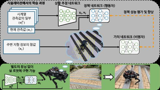 본 연구팀이 개발한 제어기, 드림워크(DreamWaQ)의 개요도. 이 네트워크는 암시적 및 명시적 추정을 함께 학습하는 추정기 네트워크, 제어기로 작동하는 정책 네트워크 및 훈련 중 정책을 안내하는 가치 네트워크로 구성된다. 실제 로봇에 구현할 때는 추정기와 정책 네트워크만 사용된다. 두 네트워크 모두 로봇에 탑재된 온보드 컴퓨터에서 1ms 미만으로 실행된다.