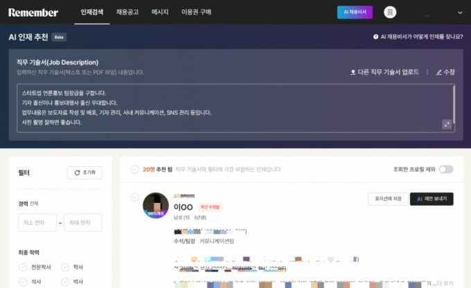 리멤버, 25일 'AI 채용비서' 베타 출시…한달간 테스트 후 보완해서 정식 서비스 할 예정