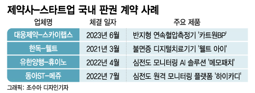 지난해부터 국내 주요 제약사와 의료기기 스타트업의 판권 계약 소식은 꾸준히 들리고 있다. 유한양행은 지난해 4월 의료기기 스타트업 휴이노와 심전도 모니터링 인공지능(AI) 솔루션인 '메모패치'에 대한 국내 판권 계약을 맺었다. 메모패치는 최대 2주간 측정한 심전도를 AI로 분석해 부정맥을 비롯한 심혈관 질환의 조기 진단을 돕는 의료기기다. 유한양행은 앞서 2020년 2월, 휴이노에 50억원을 투자해 2대 주주로 등극하며 파트너십을 강화해왔다. 조욱제 유한양행 사장은 "오랜 기간 준비한 만큼 유한의 영업력으로 빠르게 변화하는 심전도 분석 시장을 리딩하는 성과를 이루어 낼 것"이라고 말했다.
