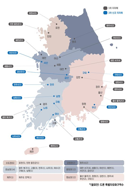 드론특별자유화구역은 기존 운영 중인 29개 구역에 18개 구역을 추가한다. 신규 지역은 부산(2), 충남서산(3)·금산(2), 전북전주(1)·남원(1), 전남나주(3)·여수(2)·구례(3), 경북구미(1) 등이다. 구역은 2년 단위 갱신한다.