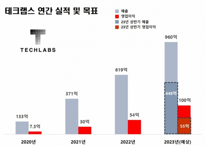 테크랩스의 2분기 매출액과 영업이익은 각각 225억원, 32억원이다. 회사는 올해 매출 960억 원, 영업이익 100억 원을 목표로 하고 있다.