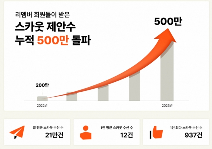 400만 회원을 보유한 비즈니스 커리어 플랫폼 '리멤버'를 통해 매월 회원들이 받는 스카웃 제안은 평균 21만건에 달하는 것으로 나타났다. 1명당 받는 평균 스카웃 제안은 12건이었고, 무려 937건의 최다 스카웃 제안을 받은 사람도 있었다.