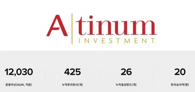 1988년 설립된 에이티넘인베스트먼트는 현재까지 26개 펀드를 결성했고 이중 22개 펀드의 청산을 완료했다. 누적 400개 이상 스타트업 투자했으며 주요 포트폴리오는 두나무 비상장 (115,000원 ▲1,000 +0.88%), 원티드랩 (3,690원 ▼25 -0.67%), 에코마케팅 (10,900원 ▲40 +0.37%), 리디, 오픈엣지테크놀로지 (11,950원 ▼520 -4.17%), 비씨엔씨 (13,900원 ▲70 +0.51%), 레고켐바이오 (176,200원 ▼11,100 -5.93%)사이언스, 고바이오랩 (6,480원 ▲150 +2.37%), 프리시젼바이오 (2,800원 ▼55 -1.93%) 등이 있다.