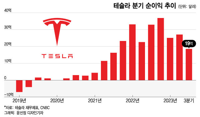 3Q 순이익, 전년비 44% 감소테슬라는 올 3분기 순이익이 18억5000만달러, 주당 53센트로 집계됐다고 밝혔다. 이는 전년 동기 33억달러, 주당 95센트에 비해 44% 급감한 것이다.