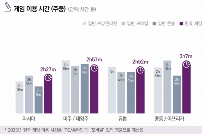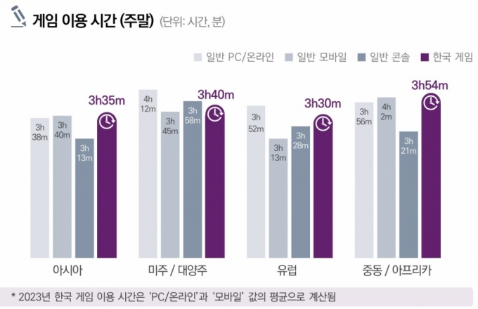 문화체육관광부와 한국콘텐츠진흥원이 8일 발간한 한국 게임에 대한 해외 게임 이용자들의 인식과 이용 실태를 정리한 '2023 해외 시장의 한국 게임 이용자 조사' 보고서에 따르면 K-게임의 하루 평균 이용 시간을 권역별로 비교해본 결과, 주중과 주말 모두 브라질에서 상대적으로 높게 나왔다. 주중은 브라질(3시간 39분), 프랑스·사우디아라비아(각각 3시간 26분), 인도(3시간 19분) 순으로 집계됐다. 주말은 브라질(4시간 39분), 인도네시아(4시간 13분), 아랍에미리트(4시간 10분), 독일(4시간 4분) 순이었다.