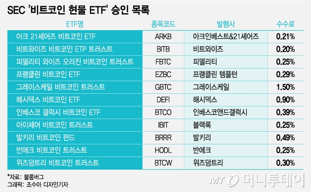 SEC는 10일(현지 시각) 홈페이지 성명을 통해 비트와이즈, 그레이스케일, 해시덱스, 블랙록, 발키리, BZX, 인베스코, 반에크, 위즈덤트리, 피델리티, 프랭클린 등 11개의 비트코인 현물 ETF를 승인했다고 밝혔다.