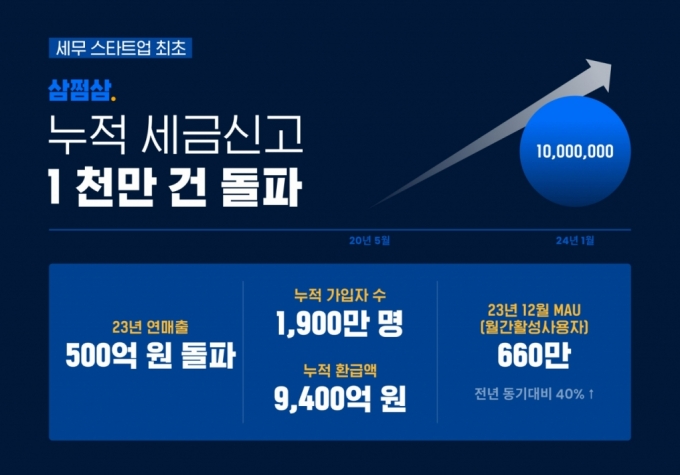 삼쩜삼의 누적 가입자는 1900만명, 누적 환급액 9400억원, 지난해 연매출은 500억원을 기록했다. 지난해 6월에는 중소벤처기업부로부터 사업성·혁신성·시장성을 인정받아 '예비유니콘'에도 올랐다.