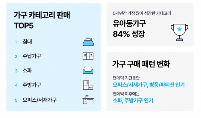 5년 새 가장 변화가 큰 분야는 '유아동가구'로 나타났다. 출산율 하락에도 불구하고 아이에 대한 투자가 늘어난 결과다. 전체 가구 판매액 중 유아동가구가 차지하는 비중은 2019년 0.3%에서 2023년 2%로 늘어났다.