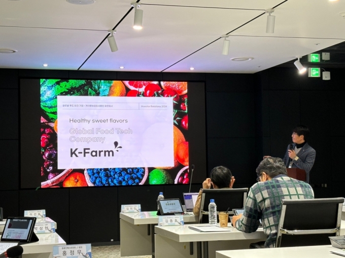 [이 기사에 나온 스타트업에 대한 보다 다양한 기업정보는 유니콘팩토리 빅데이터 플랫폼 '데이터랩'에서 볼 수 있습니다.] 이근복 케이팜 농업회사법인 대표가 29일 열린 '2024년 농림수산식품경영체 정기 4차 IR'에서 발표를 하고 있다./사진=남미래 기자"최근 건강을 해치지 않으면서 즐길 수 있는 단맛, '제로슈가'를 찾는 사람들이 늘고 있습니다. 천연 감미료인 스테비아를 활용한 토망고(스테비아 토마토)를 중동, 유럽 등에 수출하는 등 신선식품 시장에서도 대체 감미료의 수요가 높은 상황입니다."