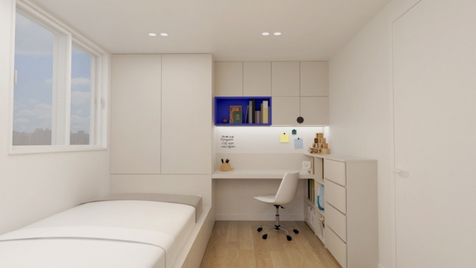 구체적으로 △수납형 침대 프레임 △책상 및 상부장 △오픈 수납장 및 4단 서랍 △붙박이장 등으로 구성됐다. 붙박이장은 하단에 가로로 긴 수납장이 마련되어 캐리어나 운동용품 등 부피가 큰 물건을 보관할 수 있다.