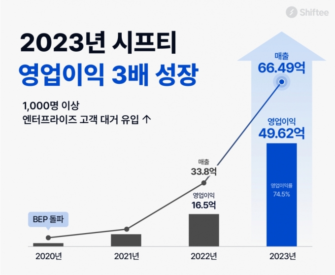 시프티의 지난해 매출액은 전년도 33억8000만원에서 96% 성장했다. 영업이익도 16억5000만원에서 3배 이상 늘었다. 영업이익율은 74.5%에 달한다. 직원수 1000명 이상인 고객사들이 대거 유입되면서 매출을 견인했다.