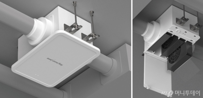 이 시스템은 저전력 설계를 통해 동일면적 기준 일반 선풍기의 1/10, 특정 공기청정기의 1/6 수준의 전기를 소비한다. 저전력 제품을 쓰면 전기생산을 위해 발생하는 탄소를 줄이는 효과를 거둘 수 있다. 에어솔루션은 그동안 코트라(KORTA), 오투타워 등에 설치돼 효과를 검증했다. 어썸레이의 에어솔루션 주거용 제품 '에어썸'/사진=어썸레이