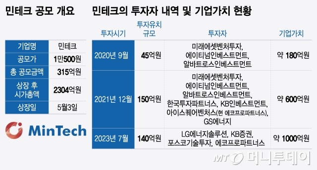민테크는 지난해 프리IPO에서 상장주관사인 KB증권, 포스코기술투자, 에코프로파트너스와 SI인 LG에너지솔루션로부터 140억원을 유치했다. 시리즈B에 이어 두차례 참여한 에코프로파트너스는 약 50억원을 투자했다. 에코프로파트너스는 상장 후에도 3.95%의 지분을 보유한다. 공모가 기준으로 약 3~ 4배 가량의 수익을 올릴 것으로 보인다.