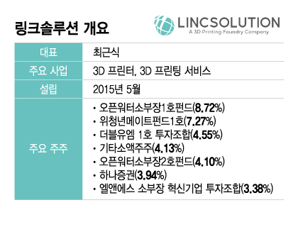 2015년 설립한 링크솔루션은 3D 프린터 장비 제조·판매와 이를 활용한 3D 프린팅 서비스를 제공한다. 동종업계과 비교해 강점은 소재 호환성이 좋다는 점이다. 3D 프린터는 일반적으로 생산자가 만든 전용 소재를 사용해야 하지만, 링크솔루션은 타사 소재도 이용이 가능하도록 개방형으로 설계했다.