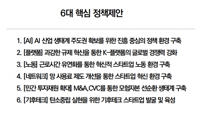 제안서는 AI(인공지능), 플랫폼, 노동, 네트워크, 투자, 기후테크 등 6대 핵심 아젠다를 중심으로 향후 정부가 중점적으로 추진해야 할 스타트업 관련 정책 방향을 제시했다.