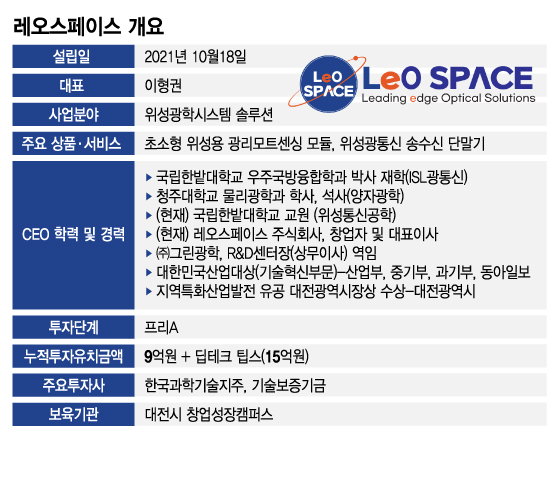 2021년 대전에서 설립된 레오스페이스(LEOSPACE)는 위성에 장착해 지구를 촬영하는 '지구 관측 위성 카메라'와 위성끼리 레이저로 데이터를 주고받는 '자유공간광통신(FSO) 단말기' 개발을 양대축으로 삼아 빠르게 성장하고 있는 우주 광학 전문기업이다.