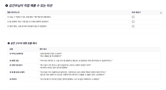 이때 실전 고수를 선택하면 △상황의 본질 파악 △직접 해볼 수 있는 미션 △대화법 등을 구체적으로 알려준다. 특히 엔비아이는 대화를 시작할 때의 분위기까지 제안해주는데 "부담 없는 제안이 핵심이니 '너랑 그냥 이야기해보고 싶다'는 자연스러운 톤이 중요하다"고 조언한다. 또한, 아이스브레이킹 → 본론 진입 → 진짜 이유 듣기 → 공감 및 협의 → 마무리 등 대화 흐름에 맞춘 구체적인 멘트를 제공해 불편할 수 있는 대화를 효과적으로 풀어낼 수 있도록 돕는다.