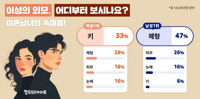 남녀, 외모 중 가장 먼저 보는것은…미혼남녀 1.4만명에 물으니