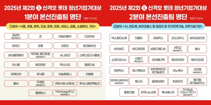 [이 기사에 나온 스타트업에 대한 보다 다양한 기업정보는 유니콘팩토리 빅데이터 플랫폼 '데이터랩'에서 볼 수 있습니다.] '리틀 신격호'를 찾는 제2회 신격호 롯데 청년기업가대상(이하 신격호창업대회) 예선에서 ①분야(식품, 유통, 화학, 건설, 문화, 관광, 서비스, 금융, 소셜벤처, 기타) 26개팀, ②분야(AI(인공지능), 반도체, 바이오헬스 등 딥테크 및 국가전략기술, 과학기술기반) 29개팀 등 총 55개팀이 본선에 진출했다.