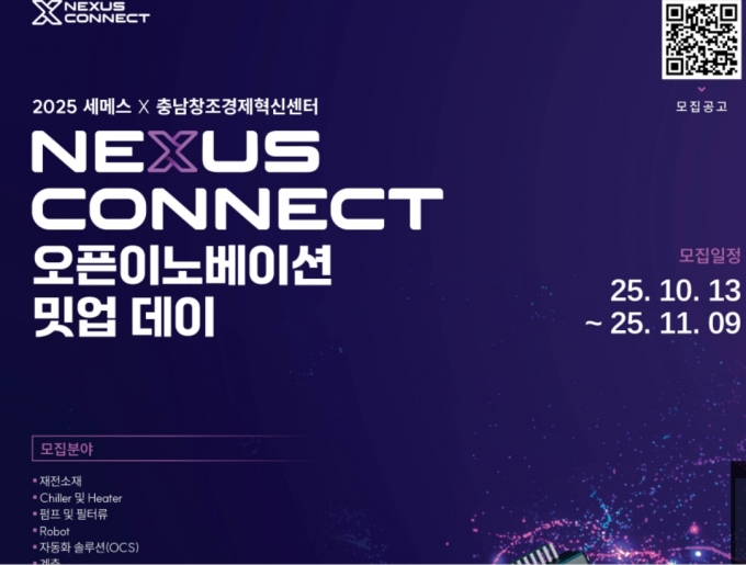 충남혁신센터는 '2025 세메스 × 충남창조경제혁신센터 넥서스커넥트(Nexus Connect) 오픈이노베이션 밋업 데이' 참여 기업을 다음달 9일까지 모집한다. 세메스는 삼성전자 (95,000원 ▲3,400 +3.71%) 자회사로 국내 대표적 반도체·디스플레이 제조장비 기업이다.