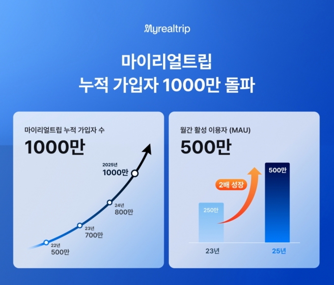 마이리얼트립은 2022년 누적 가입자 수 500만명을 기록한 이후 3년만에 1000만명을 넘어섰고 동시에 월간 활성 이용자(MAU) 500만명을 달성했다. 특히 최근 2년간 월 거래액이 꾸준히 증가해 항공 부문은 약 80%, 투어·액티비티와 숙박 부문은 각각 100%, 200% 이상 성장하며 주요 카테고리 전반에서 상승세를 기록했다.