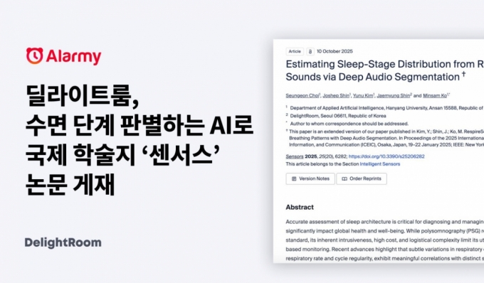 글로벌 수면-기상 솔루션 '알라미' 운영사 딜라이트룸은 수면 호흡 분석을 통한 수면 단계 판별 AI(인공지능) 모델에 대한 연구 논문을 센서 기술 분야 SCI급 국제 학술지 '센서스'에 게재했다고 22일 밝혔다.
