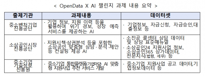 과제를 출제하는 기관은 중소벤처기업진흥공단, 소상공인시장진흥공단, 중소기업기술정보진흥원 등 3곳이다. 기관들이 보유한 데이터를 제공하고 △중소기업 성장·위험 예측 △소상공인 맞춤 컨설팅 △중소기업 통합플랫폼 기반 지원사업 추천 등 과제를 수행하게 된다. 각 기관에서 제공하는 데이터는 가공·비식별화해 제공될 예정이다.