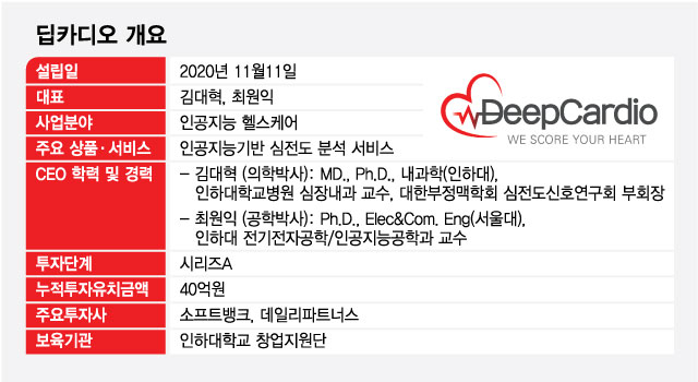 (왼쪽부터)이상철 교수, 최원익 교수, 김대혁 교수, 백용수 교수/사진=딥카디오 김 교수는 AI 심장 진단 스타트업 딥카디오의 공동창업자이자 대표이사다. 그는 2020년 인하대병원 심장내과의 백용수 교수, 인하대 컴퓨터공학과 최원익·이상철 교수와 함께 회사를 설립했다. 창업팀은 SCI급 논문 190여편, 국내 특허 40건 이상, 기술이전 17건을 보유한 정상급 연구진으로, 임상 빅데이터와 심전도 데이터를 결합해 심장 질환 위험을 예측하는 AI 알고리즘 '스마트 ECG'를 개발했다.