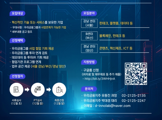 센터별로 △핀테크·플랫폼·데이터(서울) △블록체인·핀테크(부산) △콘텐츠·혁신제조·ICT(경남)에 특화돼 있으며 혁신적 기술 또는 서비스를 보유한 기업이면 신청할 수 있다. 우리금융그룹과 사업연계가 가능하면 우대한다.
