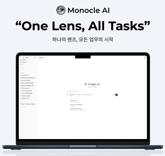 모노클 AI는 챗GPT, 제미나이, 클로드 등 여러 생성형 AI를 한 화면에서 쓰는 AI 서비스다. 기업 내부 문서와 데이터도 함께 참고해 검색과 요약을 한 번에 돕는 것이 특징이다.