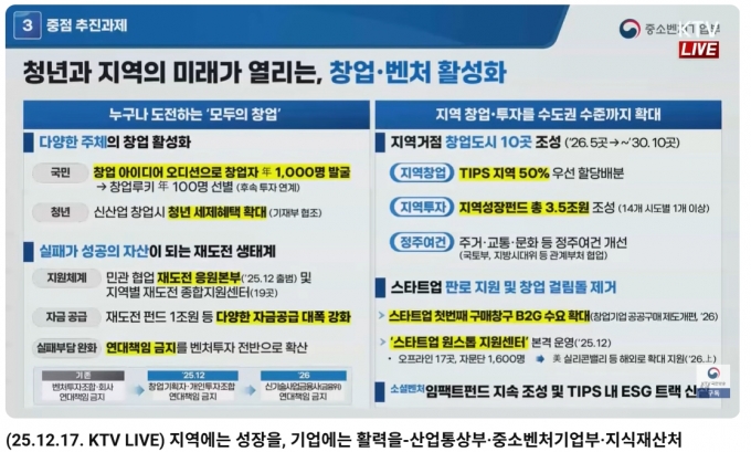 이 대통령은 "재도전펀드도 늘리시고, 실패를 자산삼아 재기하는 걸 많이 보여주고 격려하고, 판도 깔아주고, 평가할 때도 (실패가 감점요인이 아니라) '세 번 실패하면 플러스 3점' 같은 방식으로 하면 좋을 것"이라고 말했다. [세종=뉴시스] 강종민 기자 = 한성숙 중소벤처기업부 장관이 17일 세종시 정부세종청사에서 2026년 주요 업무계획을 발표하고 있다. 2025.12.17. ppkjm@newsis.com /사진=강종민