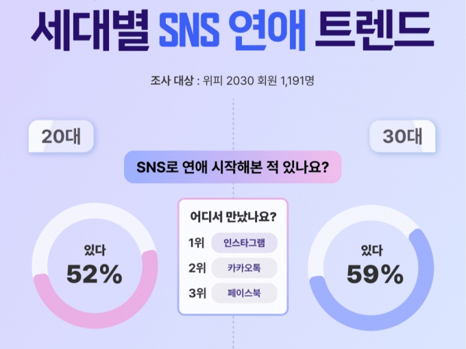 세대별로 가장 많이 사용하는 SNS는 달랐지만, 연애의 출발점은 공통적으로 인스타그램이 1위였다. 20대는 인스타그램(88.8%)·카카오톡(82.9%)을, 30대는 카카오톡(88.4%)·인스타그램(71.9%)을 가장 많이 사용했지만, SNS 연애 경험자 중 20대 69.3%, 30대 55.3%가 인스타그램에서 관계가 시작됐다고 답했다.