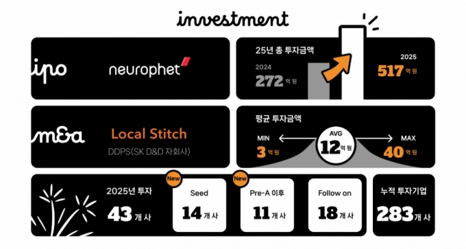 연간 총 투자액은 전년(272억원) 대비 약 90% 증가한 517억원을 기록했으며 누적 투자 기업은 283개로 확대됐다. 회수(Exit) 부문에서는 뉴로핏(25,150원 ▼450 -1.76%)의 코스닥 상장과 로컬스티치의 DDPS(SK D&D 자회사) 인수 사례가 이어졌다.