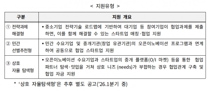 '민간 선별추천형'은 대중견기업·공공기관 등에서 자체적으로 운영하는 오픈이노베이션 프로그램으로 선별된 스타트업을 중기부가 연계 지원하는 방식이다. 스타트업과의 동반 성장 실적 및 오픈이노베이션 역량이 우수한 기업·기관의 오픈이노베이션 프로그램을 30개 내외로 선정하고 추후 여기서 선별된 스타트업을 추천받을 계획이다.