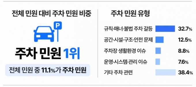 주차 민원 유형 중 △주차 매너·불법주차 관련 민원이 약 33%로 가장 큰 비중을 차지했다. △주차장 공간·시설·구조 관련 내용이 약 13%로 뒤를 이었으며 △주차장 내 흡연·소음·과속 등 생활환경 이슈가 9% 수준으로 나타났다.