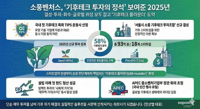 특히 지난해는 '서울시 소풍 기후테크 투자조합'도 새롭게 결성했다. 기후테크 스타트업을 위한 안정적인 성장 자금과 함께, 국내 첫 기후테크 특화 팁스(TIPS) 운용사에 선정되며 자본과 R&D(연구개발) 지원을 동시에 제공할 수 있는 토대를 마련했다.