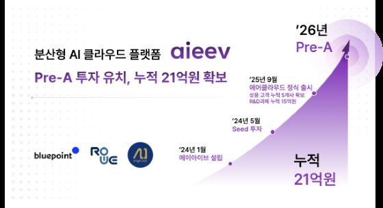 분산형 AI 클라우드 스타트업 에이아이브가 블루포인트파트너스, 로우파트너스, AI엔젤클럽으로부터 6억원 규모의 프리A 투자를 유치했다고 28일 밝혔다. 누적 투자금은 21억원이다.