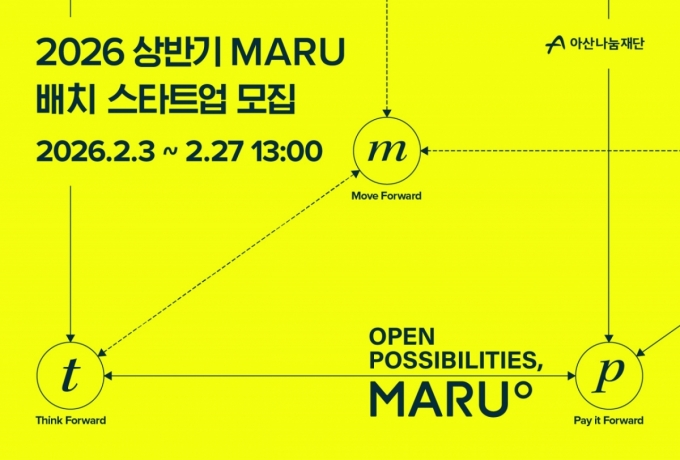 아산나눔재단이 기업가정신 플랫폼 '마루'(MARU)의 올해 상반기 배치 프로그램에 참여할 스타트업을 오는 27일까지 모집한다고 3일 밝혔다.